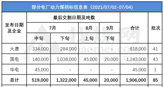 据不完全统计,7月2日-7月4日,大唐、国电、华能、华电等公司发布动力煤询价(竞价)信息85批次,涉及动力煤190.6万吨。其中:7月份交货184.1万吨,8月份交货4.5万吨,9月份交货2万吨。