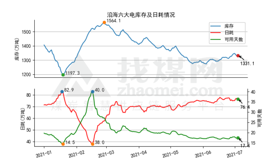日耗、库存变化不大。7月4日,沿海六大电合计库存1331.1万吨(+1.2),日耗76.4万吨(-0.62),可用天数17.4天(+0.16)。