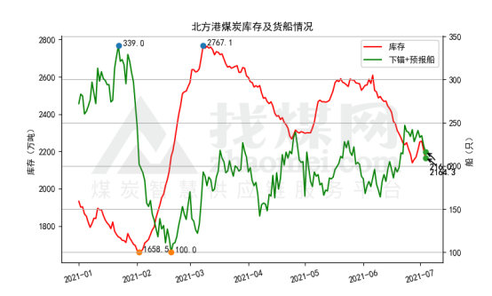 港口库存止升回降。7月4日,北方港调进164.3万吨(+1),装船208.6万吨(-5.5),库存2164.3万吨(-44.1),下锚船及预报船216艘(-8)。