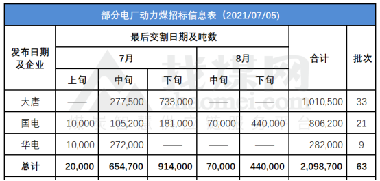 据不完全统计,7月5日,大唐、国电、华能、华电等公司发布动力煤询价(竞价)信息63批次,涉及动力煤209.9万吨。其中:7月份交货158.9万吨,8月份交货51万吨。