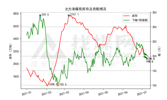 港口库存走低。7月5日,北方港调进181万吨(+16.7),装船211.2万吨(+2.6),库存2156.6万吨(-7.7),下锚船及预报船198艘(-18)。