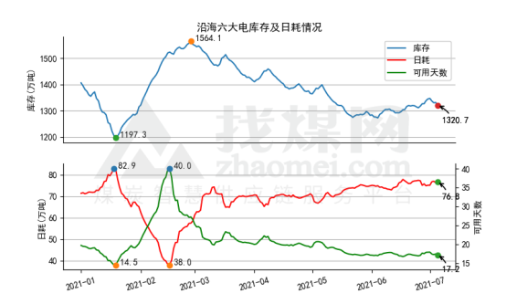 日耗略有升高,库存持续降低。7月5日,沿海六大电合计库存1320.7万吨(-10.4),日耗76.8万吨(+0.39),可用天数17.2天(-0.22)。