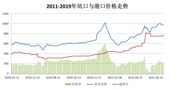 (一)数据来源。坑口价格选取榆林市动力煤5500K(硫0.6,灰分16,挥发分30)坑口价;港口价格选取秦皇岛港动力煤5500K(硫0.7,灰分18)平仓价。上述价格均为区域市场成交加权平均价。