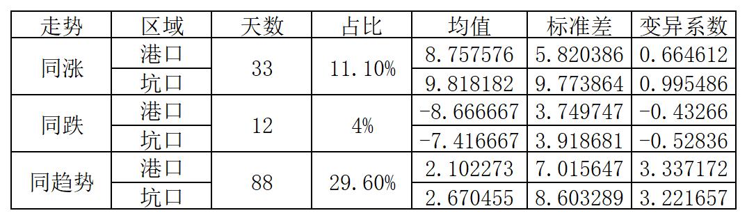(一)同趋势性。价格走势的同趋势性,指坑口和港口价格当天同涨、同跌或同平的情况。