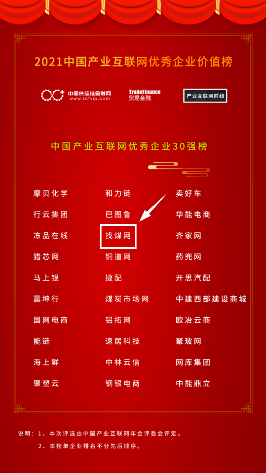 “2021中国产业互联网优秀企业价值榜”组委会从多个维度出发,进行评审与遴选,最终,找煤网荣获其中“中国产业互联网优秀企业30强”大奖。