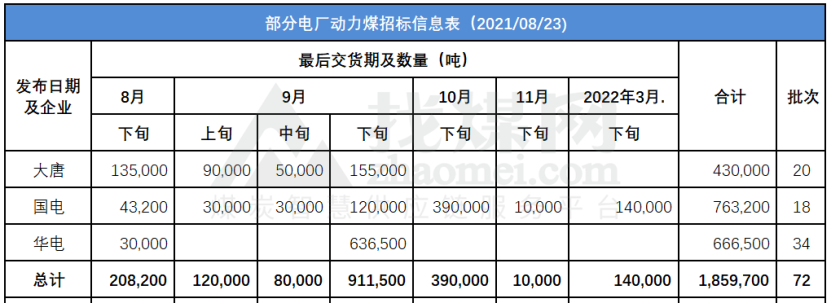 据不完全统计,8月23日,大唐、国电、华能、华电等公司发布动力煤询价(竞价)信息72批次,涉及动力煤186万吨。其中:8月份交货20.8万吨,9月份交货111.2万吨,10月份以后交货54万吨。