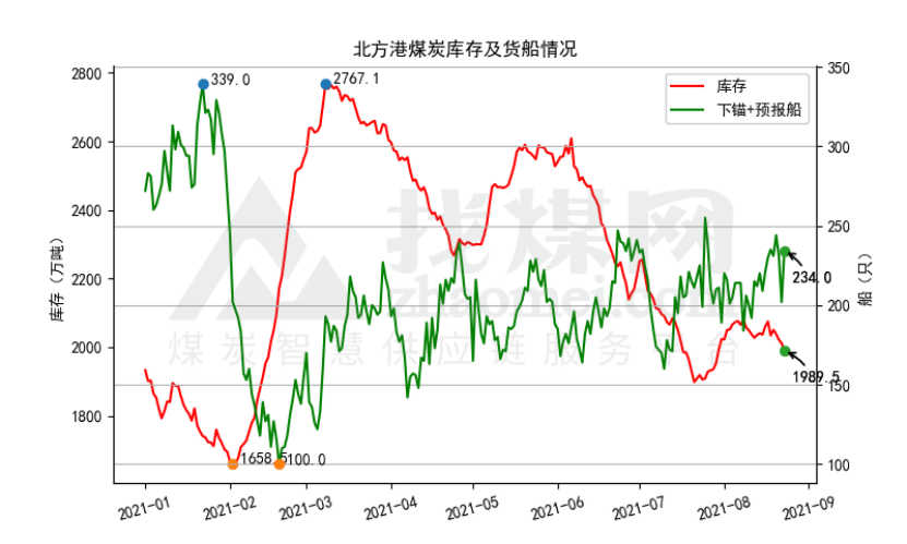 港口库存下降。8月23日,北方港调进194.1吨(-6.6),装船208.7万吨(+2.2),库存1989.5万吨(-22),下锚船及预报船234艘(+32)。