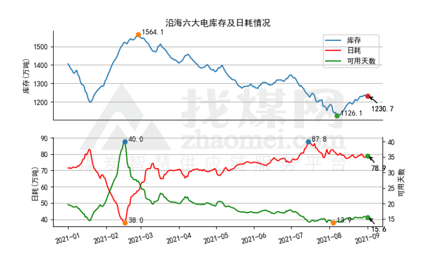 日耗、库存变化不大。9月1日,沿海六大电合计库存1230.7万吨(-2.1),日耗78.9万吨(+0.3),可用天数15.6天(-0.09)。