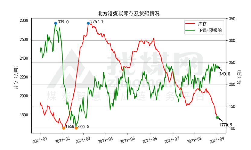 港口库存持续下降。9月1日,北方港调进179.6吨(-12.7),装船215.2万吨(+21.6),库存1770.9万吨(-35.2),下锚船及预报船240艘(--)。