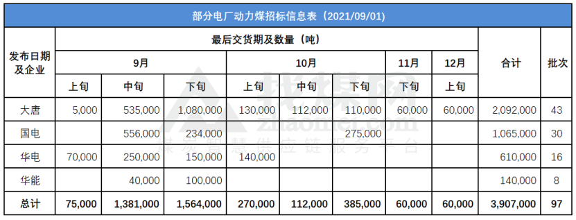 据不完全统计,9月1日,大唐、国电、华能、华电等公司发布动力煤询价(竞价)信息97批次,涉及动力煤390.7万吨。其中:9月份交货302万吨,10月份交货76.7万吨,11、12月份12万吨。