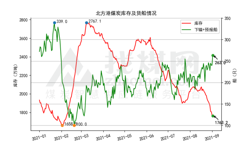 港口库存持续下降。9月2日,北方港调进200.3吨(+20.7),装船207.1万吨(-8.1),库存1763.2万吨(-7.7),下锚船及预报船263艘(+63)。