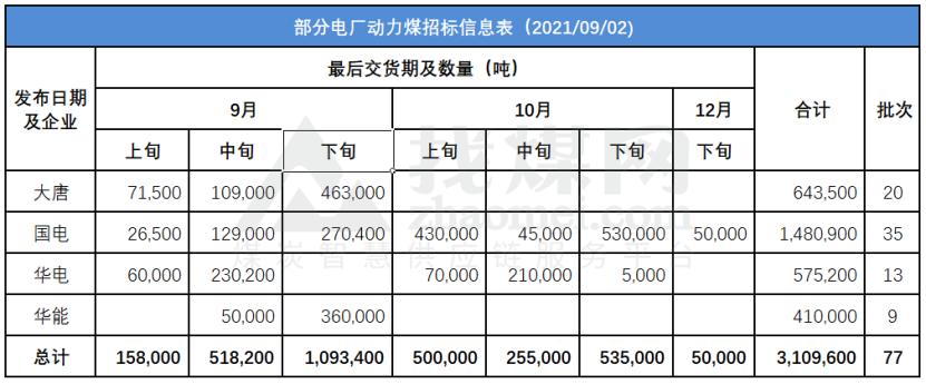 据不完全统计,9月2日,大唐、国电、华能、华电等公司发布动力煤询价(竞价)信息77批次,涉及动力煤311万吨。其中:9月份交货177万吨,10月份交货129万吨,12月份5万吨。