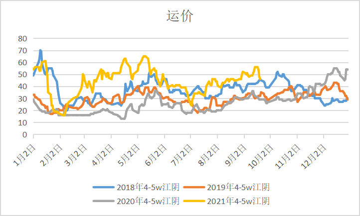 从图中看出,2020年第第三季度运价最低18元/吨,最高32元/吨;2021年第第三季度运价最低32元/吨,最高56元/吨.低点比20年高14元/吨,高点确比20年高了24元/吨。