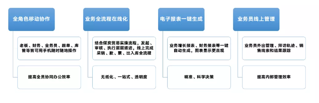 采购、销售和库存一体化线上管理系统,实现对煤炭运销过程的全面、精细化管理,集业务、财务、分析等多种功能于一体,满足大中小煤炭运销企业的不同需求,帮助企业从纸质化管理迈入信息化管理时代,实现采运销数字化。