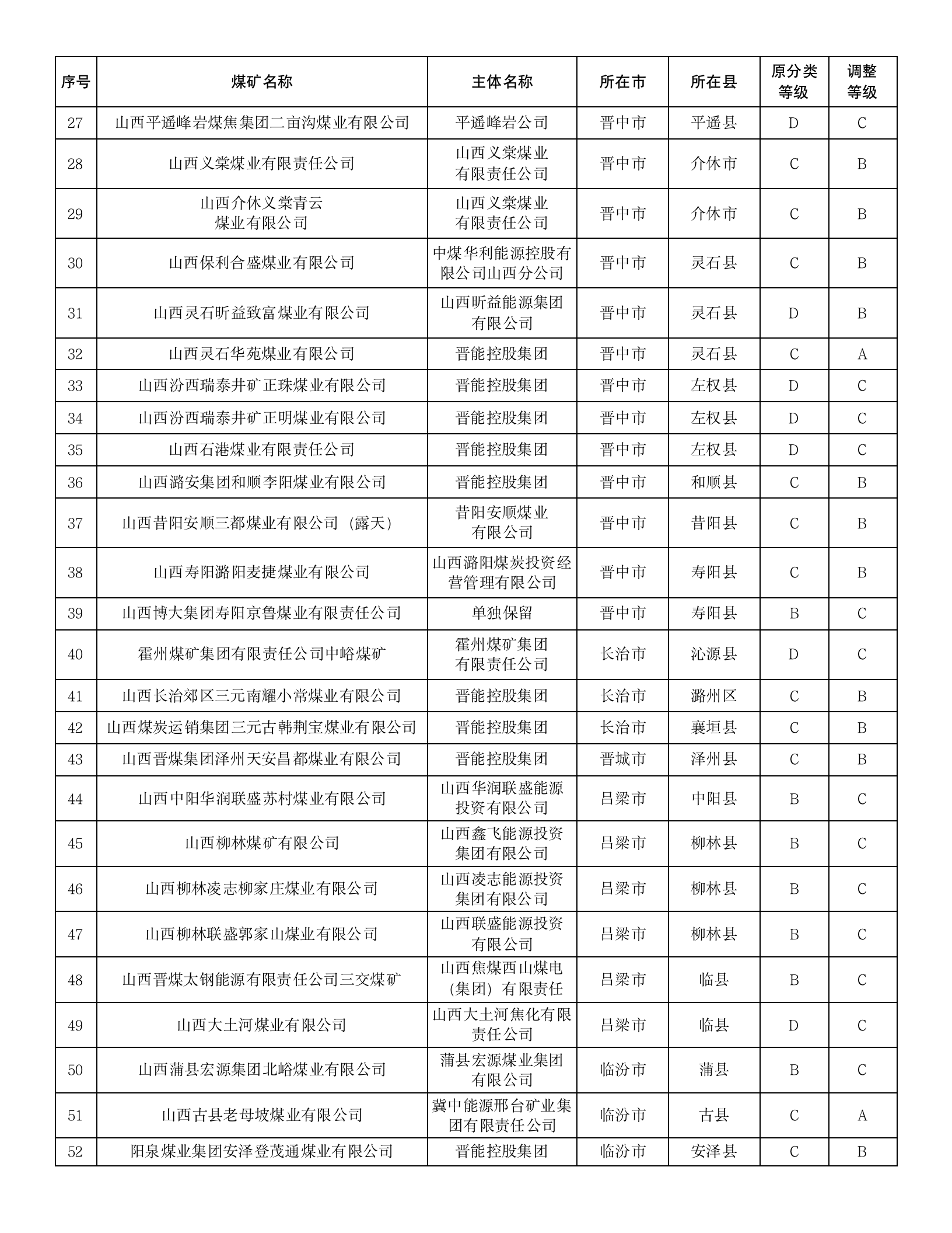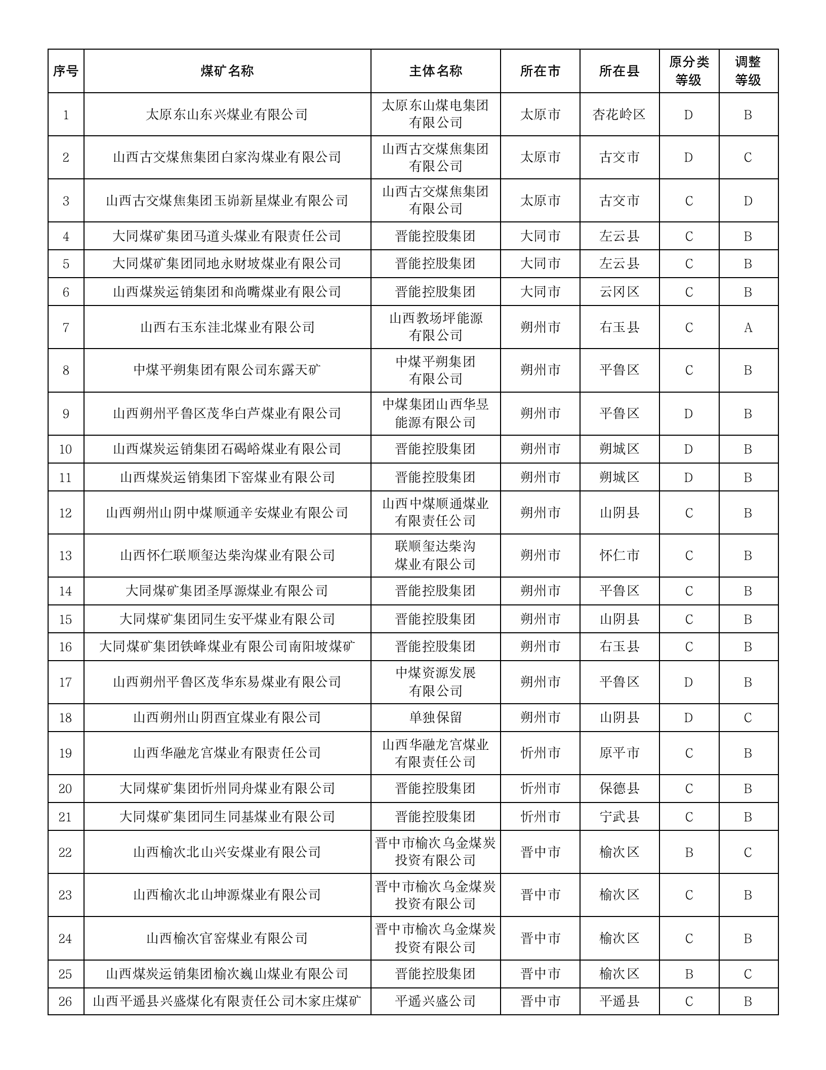 7月份山西省安全生产委员会办公室接到太原、大同、朔州、忻州等9个市52座煤矿关于调整煤矿分类等级的报告,现将调整后煤矿分类名单进行公告。